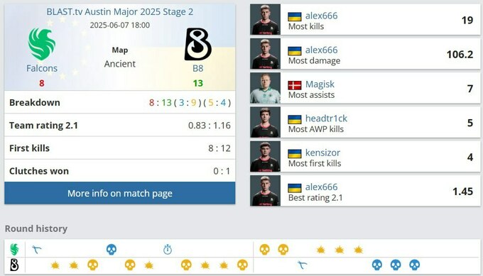 Фавориты турнира Austin Major – саудовский клуб Falcons – потерпел поражение в своем дебютном матче, уступив украинской команде B8 со счетом 8:13 на карте Ancient и опустились в нижнюю сетку со счетом 0-1.