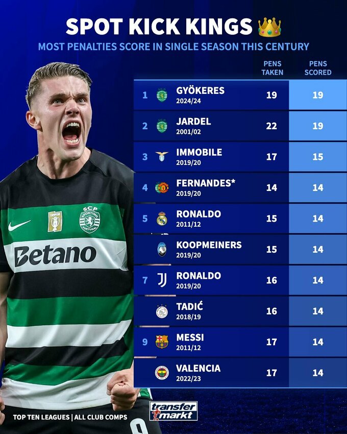 В сезоне 2024/25 шведский нападающий Спортинга Виктор Дьокереш установил еще одно интересное достижение. Он реализовал 19 пенальти за клуб во всех турнирах.