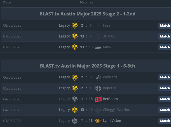 Бразильский коллектив Legacy, который изначально не должен был попасть на турнир, стал одной из главных сенсаций Austin Major. Команда прошла первую стадию с напряжeнным счeтом 3-2, а вторую – с чистым результатом 3-0, выиграв у нескольких фаворитов и уверенно вышла в заключительный этап.