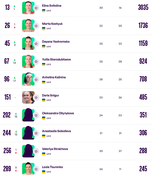 Элина идет на 13-й позиции, Марта Костюк опустилась на 26-ю строчку