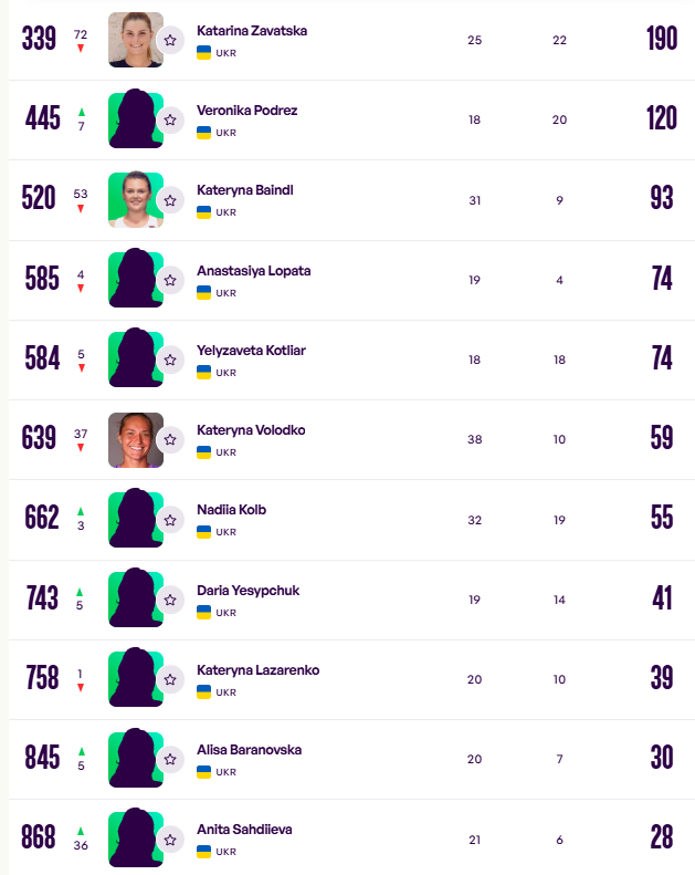 Из украинок в топ-100 парного рейтинга также находятся Надежда Киченок (55-я) и Марта Костюк (79-я).