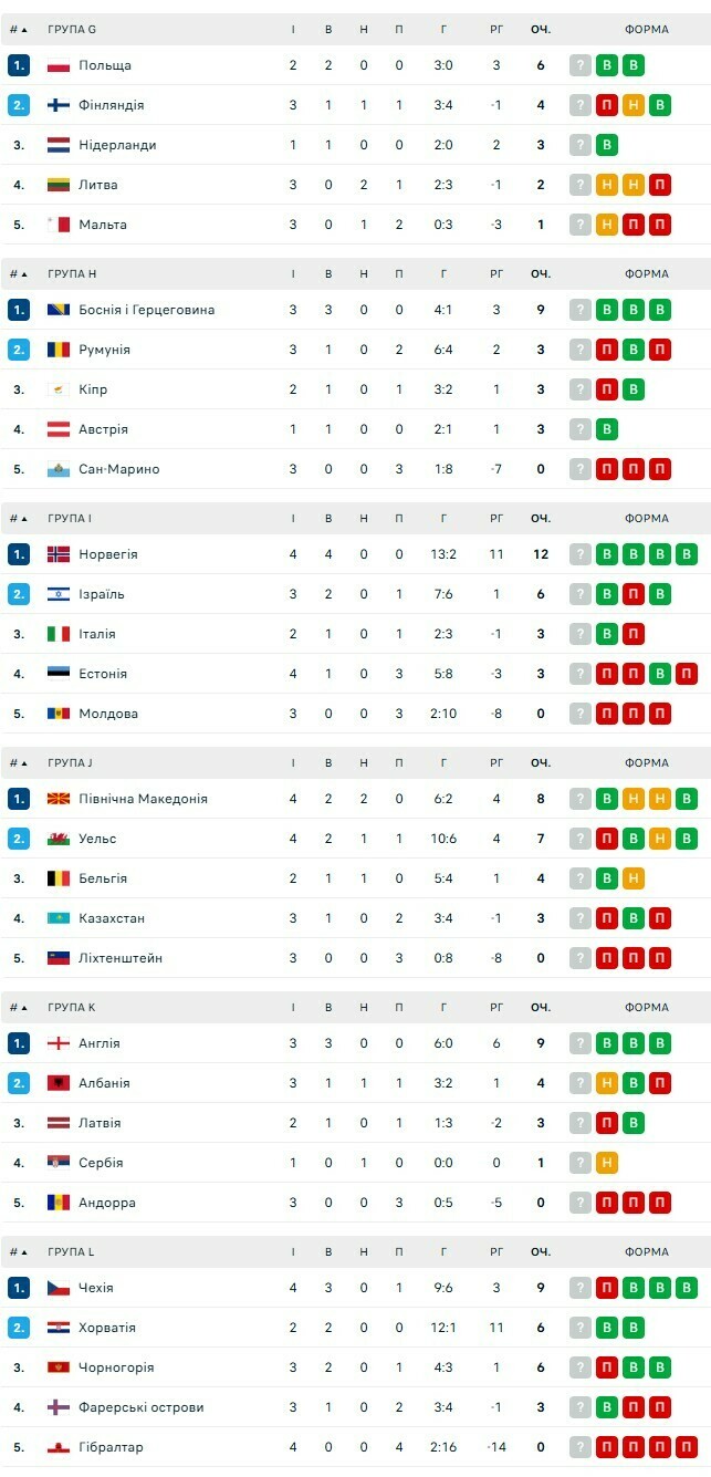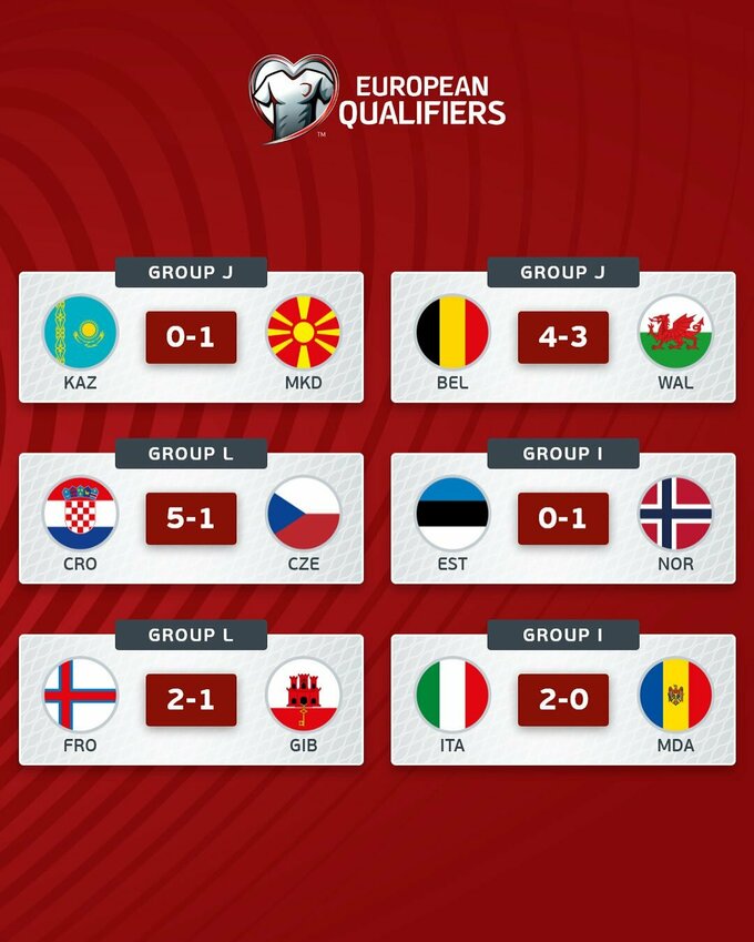 По три очка в этот игровой день взяли Хорватия (уничтожив Чехию 5:1), Норвегия (против Эстонии 1:0 с голом Эрлинга Холанда), Северная Македония и Фареры.