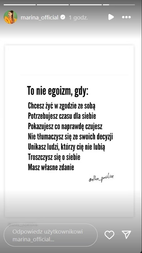 В посте говорилось о том, что забота о себе, честность с собой и право на собственное мнение не являются эгоизмом. Таким образом, Марина дала понять: поведение Левандовски — не проявление эгоизма, а осознанный выбор.