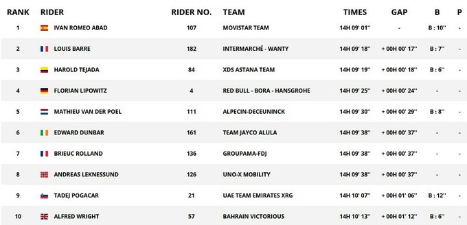 Иван Ромео стал лидером генеральной классификации. Вторым с отставанием в 17 секунд идет Луи Барре.