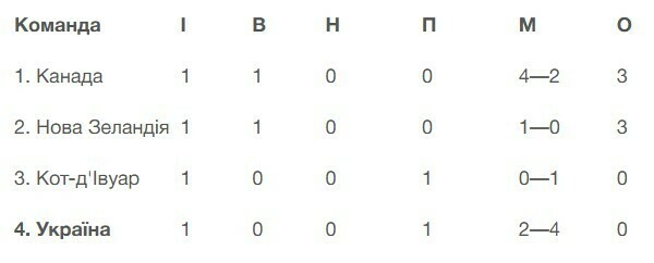 В турнирной таблице лидируют Канада и Новая Зеландия (по 3 очка), Кот-д’Ивуар и Украина идут без набранных пунктов.