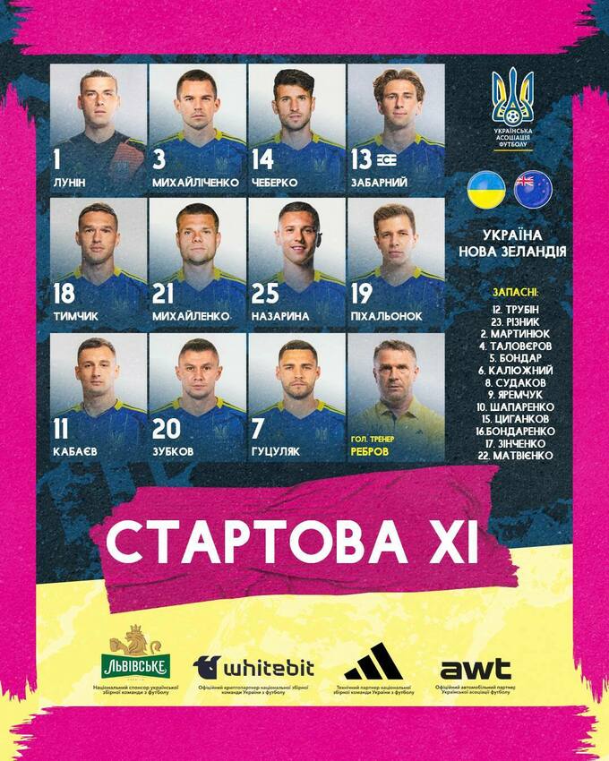 Украина: Лунин, Михайличенко, Чеберко, Забарный, Тымчик, Михайленко, Назарина, Пихаленок, Кабаев, Зубков, Гуцуляк