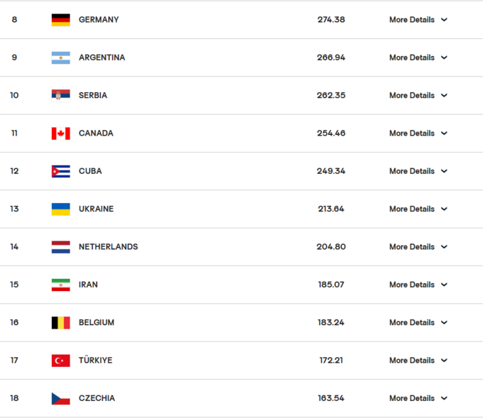 Это позволило подняться с 14-го на 13-е место, обогнав сборную Нидерландов, которая потерпела поражение от Польши в первом матче турнира.