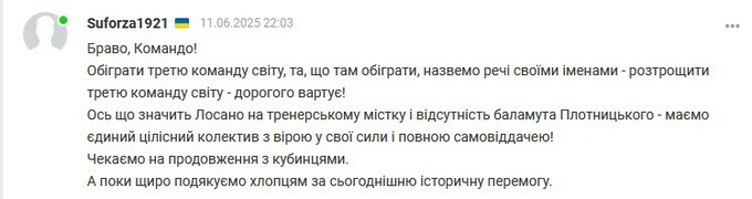 suforza1921: Браво, Команда! Обыграть третью команду мира, да что там обыграть, назовем вещи своими именами – разгромить третью команду мира – дорогого стоит! Вот что значит Лосано на тренерском мостике и отсутствие баламута Плотницкого – у нас единый целостный коллектив с верой в свои силы и полной самоотдачей! Ждем продолжения с кубинцами. А пока искренне благодарим ребят за сегодняшнюю историческую победу.