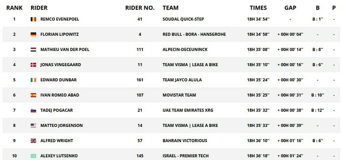 Лидером генеральной классификации после пятого этапа остается Ремко Эвенпул. Вторым с отставанием в 4 секунды идет Флориан Липовиц.
