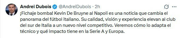 Andrei Dubois: Сенсационный трансфер! Переход Кевина Де Брюйне в «Наполи» — новость, которая меняет облик итальянского футбола. Его мастерство, видение поля и опыт поднимают клуб из южной Италии на новый уровень конкурентоспособности. Посмотрим, как тренер адаптирует его и какое влияние он окажет на Серию А и Европу.