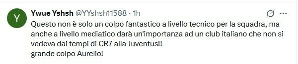Ywue Yshsh: Это не только фантастический ход для команды на техническом уровне, но и на медийном уровне, он придаст значимость итальянскому клубу, которую не видели со времен CR7 в «Ювентусе»!! Отличный ход, Аурелио!