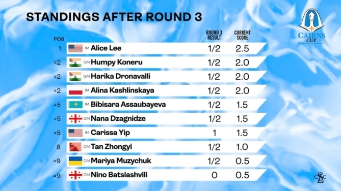 Международный мастер Элис Ли (США) продолжает единолично лидировать на Кубке Кэрнс 2025 после ничьей в третьем туре с гроссмейстером Наной Дзагнидзе, опережая трех ближайших преследовательниц на пол-очка.