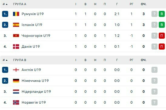 После 1-го тура в группе A лидируют Румыния и Испания, набравшие по 3 очка, у Черногории и Дании – по 0 баллов.
