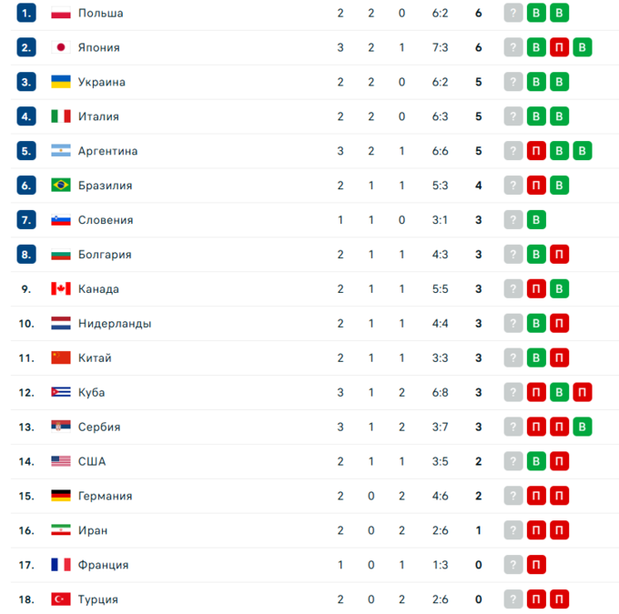 Турнирное положение Лиги наций по волейболу: Польша, Япония (по 6 очков), Украина, Италия, Аргентина (по 5 очков), Бразилия (4 очка), Словения, Болгария, Канада, Нидерланды, Китай, Куба, Сербия (по 3 очка), Германия (2 очка), Иран (1 очко), Франция, Турция (0 очков).