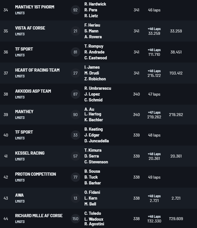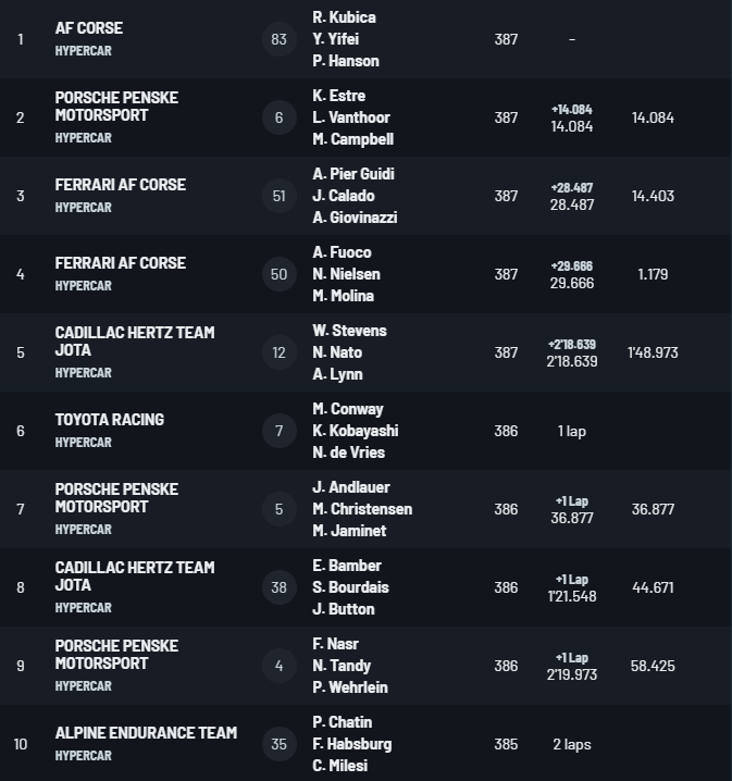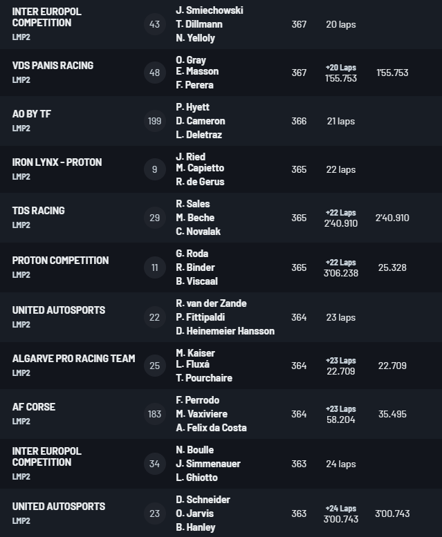 Третье место заняла Феррари №51, а действующие чемпионы – Антонио Фуоко, Мигель Молина и Никлас Нильсен – финишировали четвертыми на болиде №50, имея командное распоряжение не обгонять партнеров.