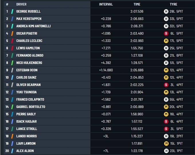 В топ-3 финишировали Ферстаппен и Андреа Кими Антонелли. Двойной подиум для Мерседеса и первый в карьере подиум для юного итальянца.
