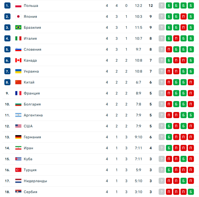 Турнирное положение Лиги наций по волейболу: Польша (12 очков), Япония, Бразилия (9), Италия, Словения (8 очков), Канада, Украина (7 очков), Китай (6 очков), Франция, Болгария, Аргентина, США (5 очков), Германия (6 очков, но только 1 победа), Иран (4 очка), Куба, Турция, Нидерланды, Сербия (3 очка)