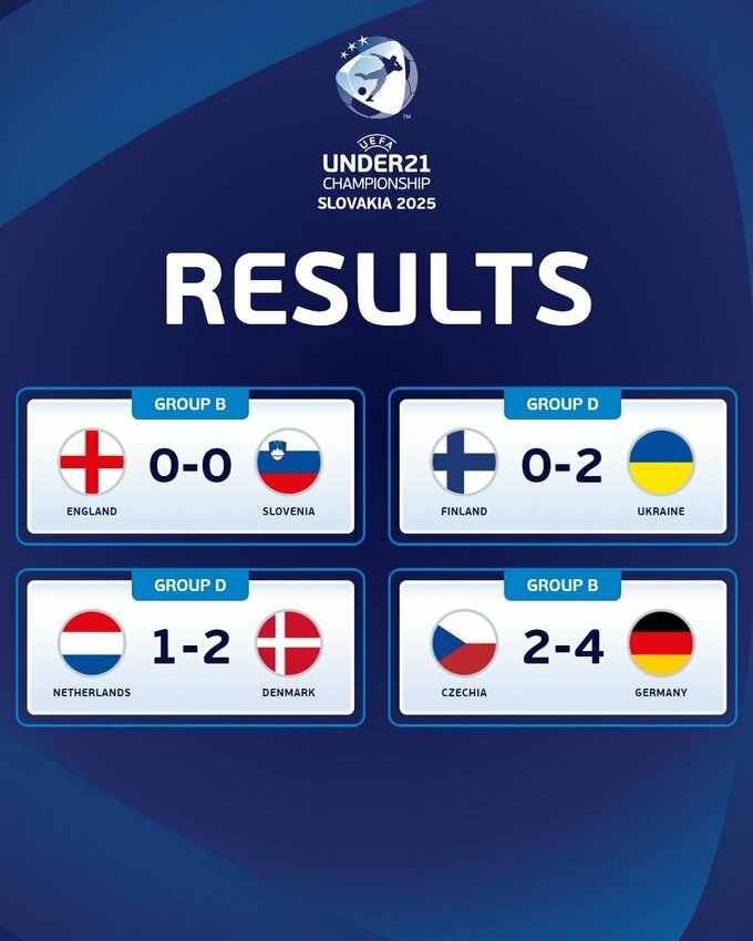 Вечером 15 июня состоялись 4 матча 2-го тура чемпионата Европы 2025 U-21.