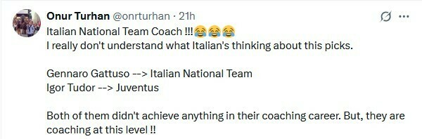 Onur Turhan: Тренер сборной Италии!!!😂😂😂 Я действительно не понимаю, что итальянцы думают об этом выборе. Дженнаро Гаттузо -> Сборная Италии. Игорь Тудор --> Ювентус. Оба ничего не добились в своей тренерской карьере. Но они тренируют на таком уровне!