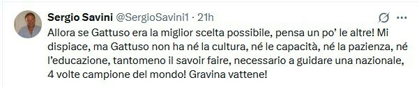 Sergio Savini: Итак, если Гаттузо был лучшим возможным выбором, подумайте о других! Извините, но у Гаттузо нет ни культуры, ни способностей, ни терпения, ни образования, не говоря уже о ноу-хау, необходимых для того, чтобы возглавить национальную команду, четырехкратного чемпиона мира! Гравина, уходи!