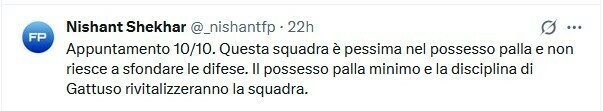 Nishant Shekhar: Оценка 10/10. Эта команда плохо владеет мячом и не может прорвать оборону. Минимальное владение мячом и дисциплина. Гаттузо оживит команду.