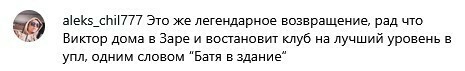 aleks_chil777: Это же легендарное возвращение, рад что Виктор дома в Заре и востановит клуб на лучший уровень в УПЛ, одним словом «Батя в здании».