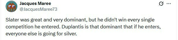 Jacques Maree: Келли Слейтер был великолепен и очень доминировал, но он не выиграл все соревнования, в которых участвовал. Дюплантис настолько доминирует, что если он участвует, все остальные идут за серебром.