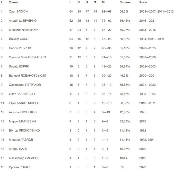 Сергей Ребров провел уже 26 матчей на посту главного тренера «сине-желтых», приблизившись к Йожефу Сабо, у которого 34 игры и 4-е место в рейтинге.