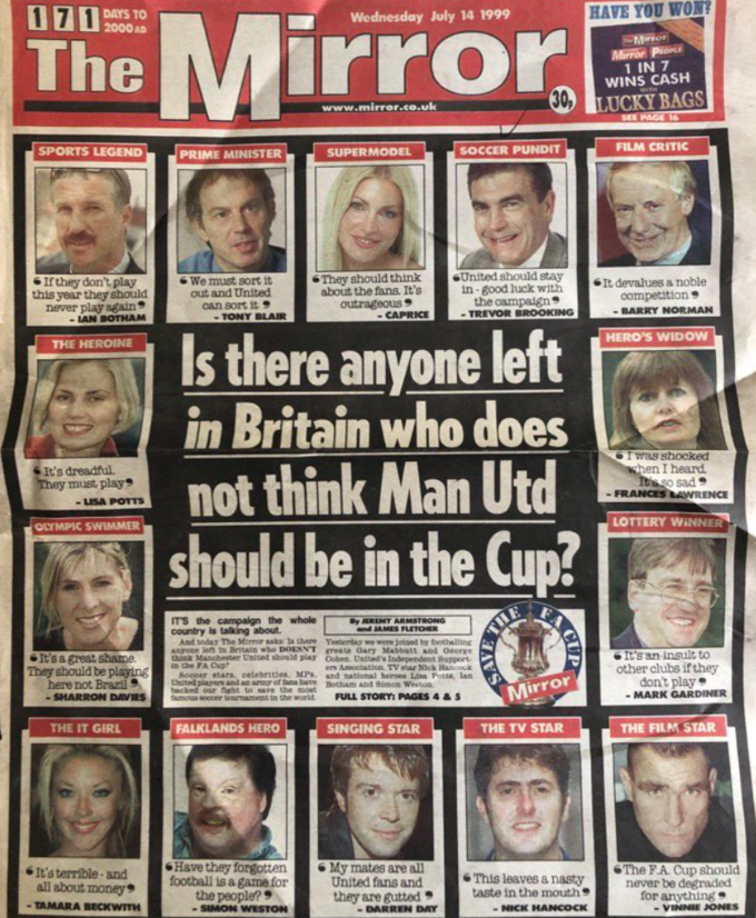 В статье, которая называлась: «Есть ли в Британии хоть кто-то, кто не считает, что «Манчестер Юнайтед» должен участвовать в Кубке?» и подавалась под лозунгом: «Спасите Кубок Англии», журналисты издания опросили 14 разных людей – от премьер-министра Великобритании Тони Блэра до ветерана Фолклендской войны – с целью узнать их мнение, создав таким образом, своего рода срез общественной позиции.