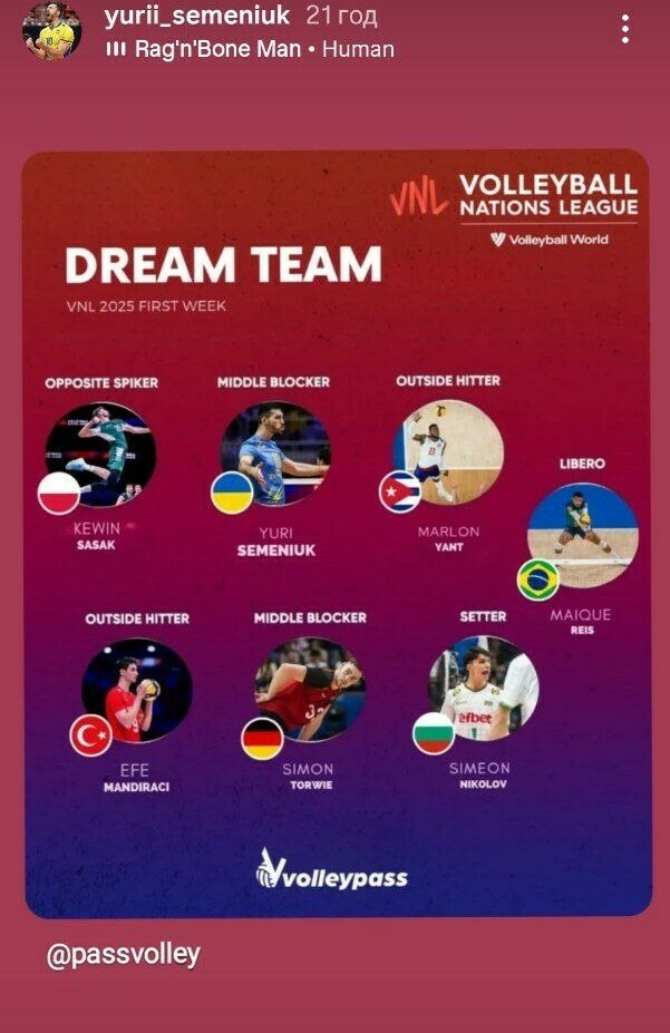 Приятным бонусом стал индивидуальный успех капитана команды Юрия Семенюка: он вошел в символическую сборную первой недели, опубликованной passvolley. Семенюк был включен в нее как игрок своего амплуа – центральный блокирующий. Об этом спортсмен сообщил в своем Instagram.