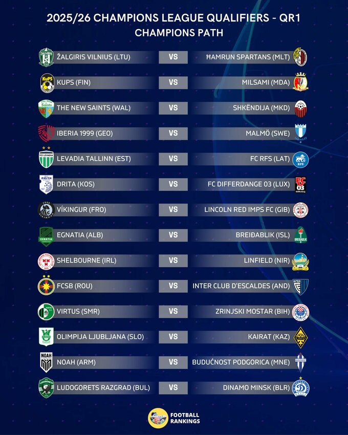 17 июня в 15:00 по киевскому времени в швейцарском Ньоне состоялась жеребьевка первого раунда квалификации Лиги чемпионов 2025/26.
