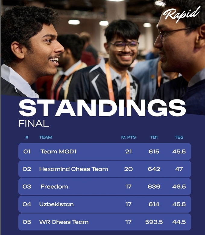 Победу на чемпионате одержала команда «Team MGD1», второе место – «Hexamind Chess Team».