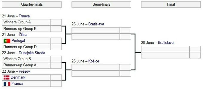 Уже определена одна четвертьфинальная пара: Дания и Франция сыграют 22 июня в Прешове.