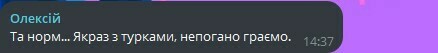 Олексій: Да норм... Как раз с турками, неплохо играем.