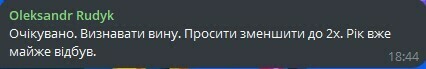 Oleksandr Rudyk: Ожидаемо. Признавать вину. Просить сбавить до 2х. Год уже почти отбыл.