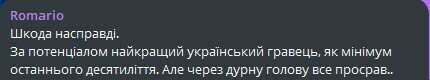 Romario: Жаль на самом деле. По потенциалу самый лучший украинский игрок, как минимум последнего десятилетия. Но из-за дурной головы все просрал.