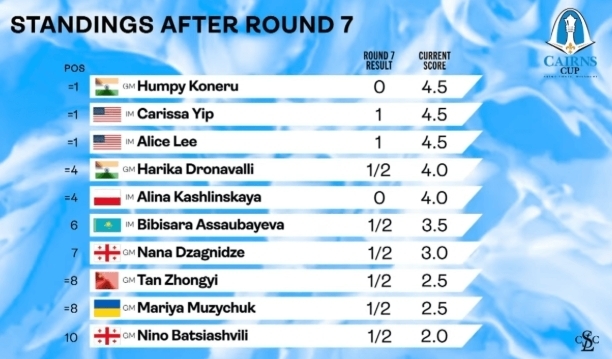 После очередной перестановки в таблице Cairns Cup 2025 снова образовалось лидирующее трио: гроссмейстер Хампи Конеру, международные мастера Карисса Ип и Элис Ли. Ип одержала победу над Хампи, в то время как Ли обыграла занимавшую второе место Алину Кашлинскую.