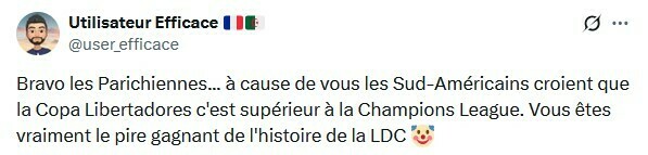 Utilisateur Efficace: Браво, парижане... из-за вас южноамериканцы считают, что Кубок Либертадорес превосходит Лигу чемпионов. Вы действительно худший победитель в истории Лиги чемпионов 🤡