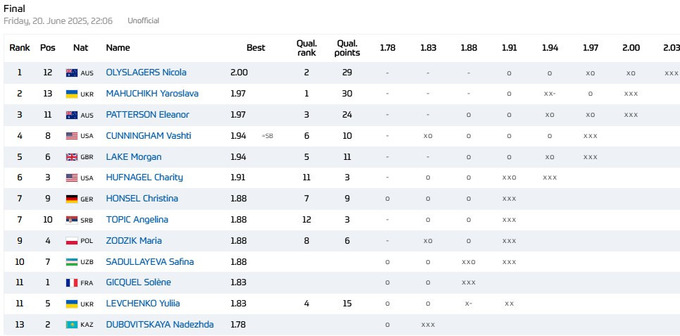 Первое место снова заняла, как и неделю назад в Стокгольме, австралийка Никола Олислагерс, которая взяла 2.00 м со второй попытки. Попытка побить рекорд Океании (2.03 м) для нее получилась неуспешной.