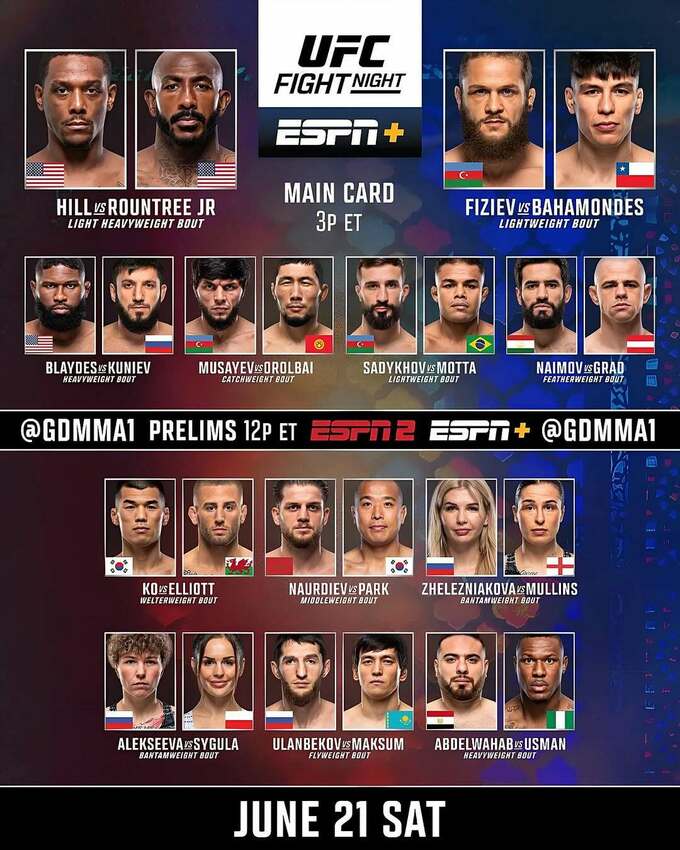 Предварительные бои стартуют в 19:00, основной кард запланирован на 22:00. Хилл и Раунтри выйдут в октагон ориентировочно 22 июня в 00:30 по киевскому времени.