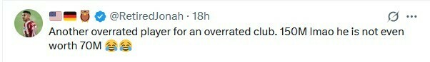 RetiredJonah: Еще один переоцененный игрок для переоцененного клуба. 150 миллионов, ха-ха, он даже 70 миллионов не стоит 😂😂