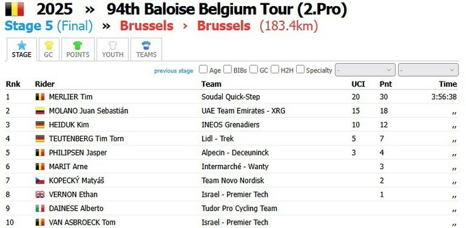 - 1. Тим Мерлир (Бельгия, Soudal–Quick-Step) – 3:56:38