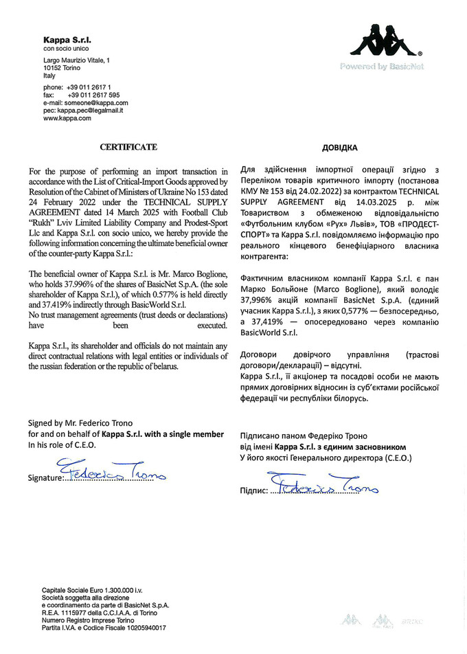 Так, отсутствие прямого контакта и непосредственного сотрудничества Kappa с россией было одним из условий, которое «Рух» выдвигал при подписании контракта о сотрудничестве, и итальянский бренд подтвердил эти обязательства. Отдельно прилагаем документ, подтверждающий, что Kappa не работает с рф и беларусью.