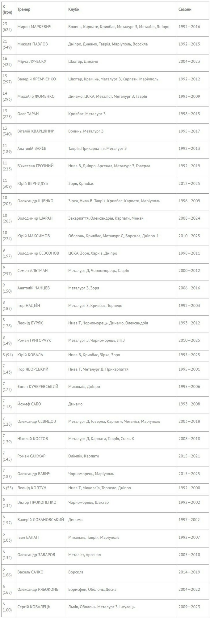 Тренеры с наибольшим количеством сезонов в чемпионате Украины