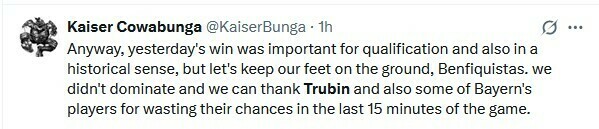 Kaiser Cowabunga: В любом случае, вчерашняя победа была важна для квалификации, а также в историческом смысле. Мы не доминировали и можем поблагодарить Трубина и некоторых игроков «Баварии» за то, что они упустили свои моменты в последние 15 минут игры.