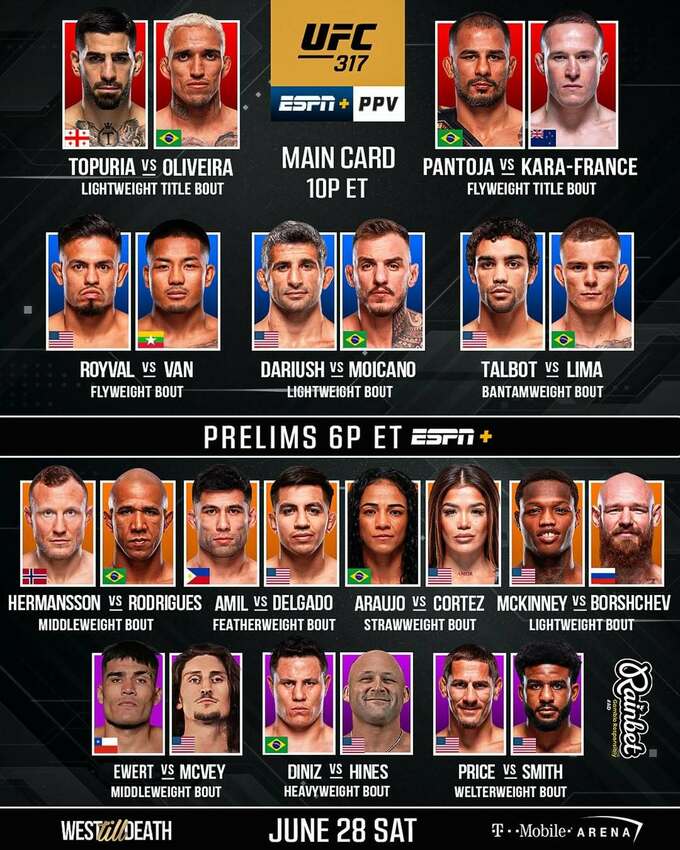 В ночь на 29 июня на арене «T-Mobile Arena» в Лас-Вегасе (США) состоится турнир по смешанным единоборствам UFC 317.