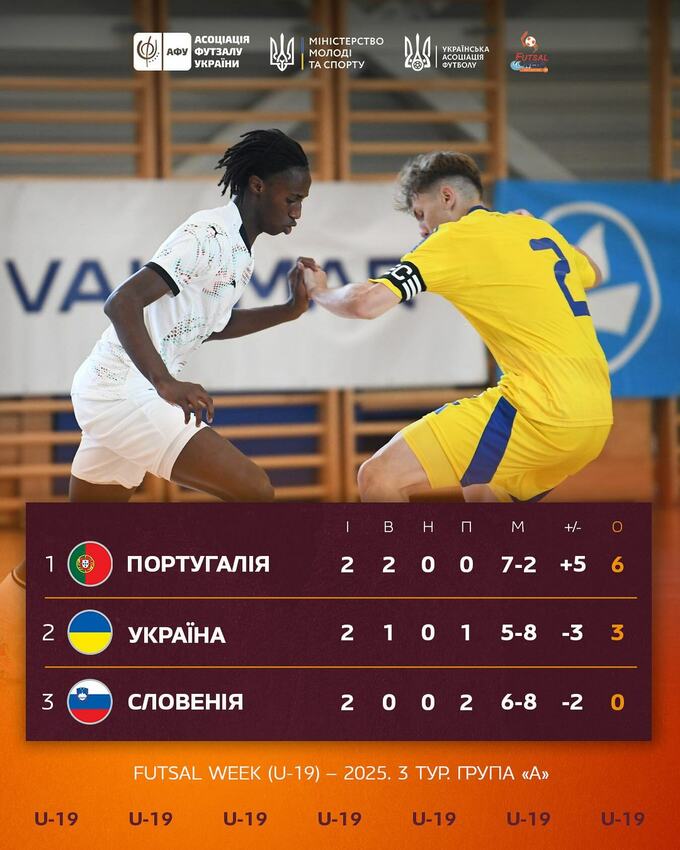 Сборная Украины по итогам 2 сыгранных матчей набрала 3 очка и заняла 2-е место. В первом матче первого этапа наша команда уступила сборной Португалии со счетом 0:4, а во втором матче Украина добыла победу со четом 5:4 над Словенией.