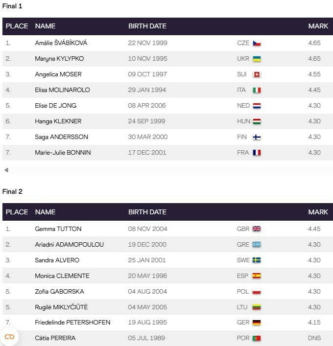 Ключевой стала высота 4.65 м, Килипко преодолела ее со второй попытки, как и Швабикова. Мозер эту высоту не взяла и завершила соревнования на третьем месте.