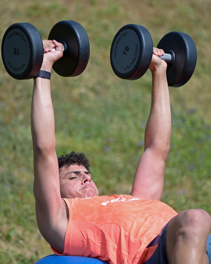 Вторая тренировка начинается в 11:00. Футболисты работают в тренажерном зале, получая нагрузку на разную группу мышц.