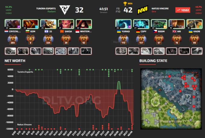 Natus Vincere на первой карте акцент сделали на керри Gyrocopter и это сработало – Артем «Yuragi» Голубев отыграл со статистикой 10/0/10. Также им отдали Puck для Copy, с которым они не проигрывали.